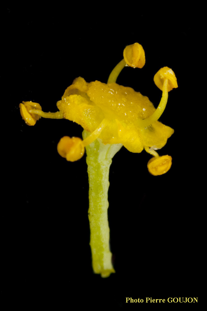 Les fleurs sont jaunes. Elles sont portées par un pédoncule court et glabre. Elles présentent 5 étamines libres. Le pistil est surmonté de 2 styles très courts.