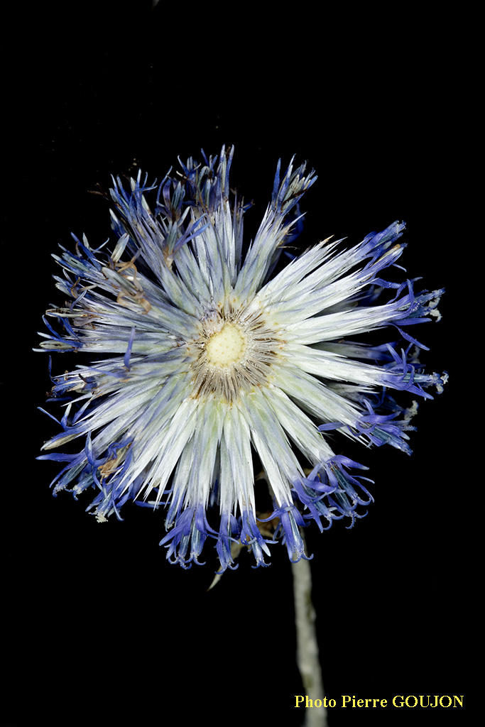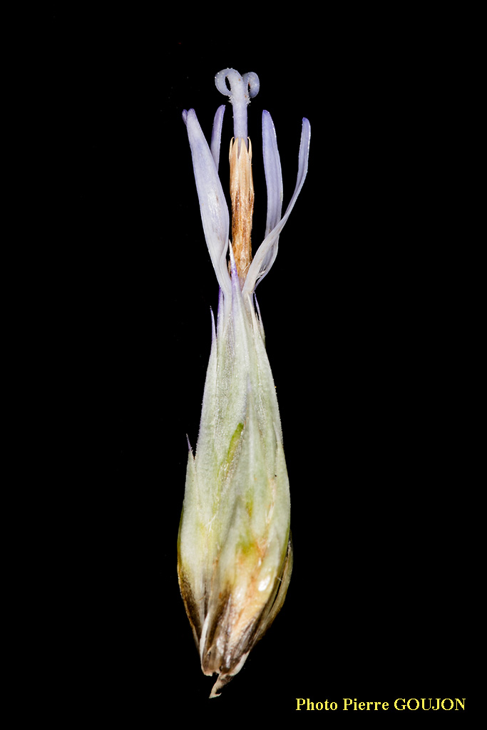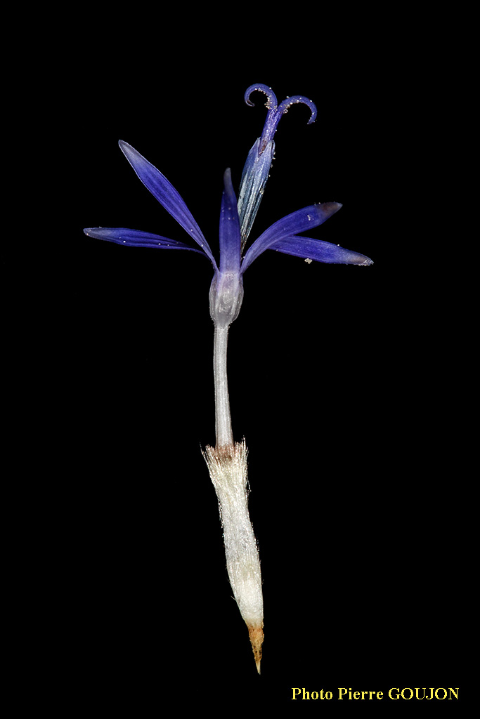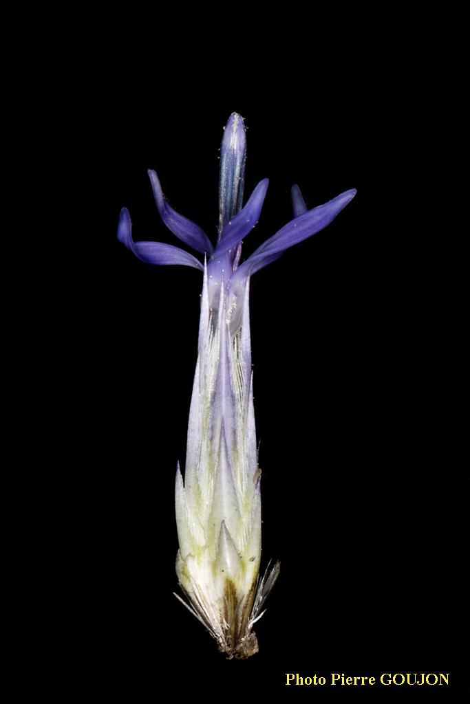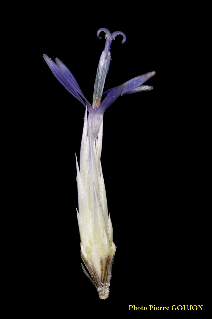 Dans un capitule, les fleurs sont toutes tubulées, bleues. Le réceptacle porte des soies fibrilleuses.