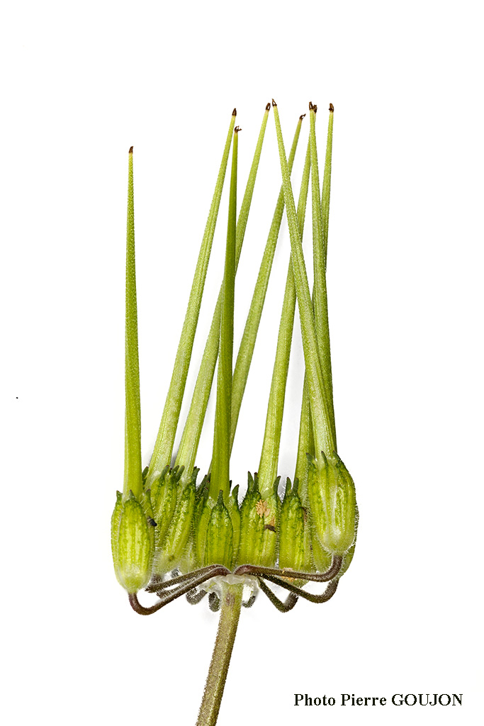Les fruits sont des akènes formés à partir des carpelles isolés. Ils sont globuleux, glabres. Ils sont terminés par une arête droite, glabre, et qui s'enroule en spirale à maturité.
