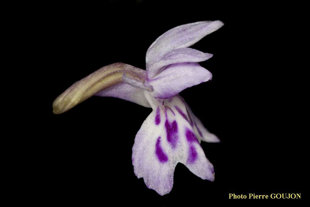 Le labelle est plan, trilobé avec trois lobes presque égaux, le lobe médian étant lui-même simple. Il est muni d'un éperon dirigé vers le bas, plus petit que l'ovaire. Il est rose ou mauve avec des marbrures violettes, parfois blanc presque uniforme. Il est égal ou légèrement plus grand que les divisions extérieures (= équivalents des sépales). Celles-ci sont dressées, et de couleur violet-mauve ou blanche. Les deux divisions intérieures (= équivalents des deux pétales supérieurs) sont un peu plus petites que les extérieures. Elles sont convergentes, et de couleur violet-mauve ou blanche.